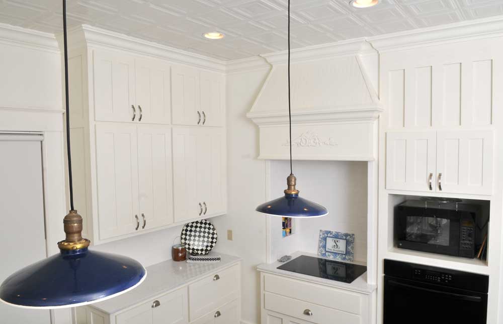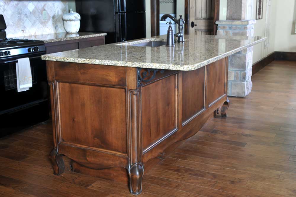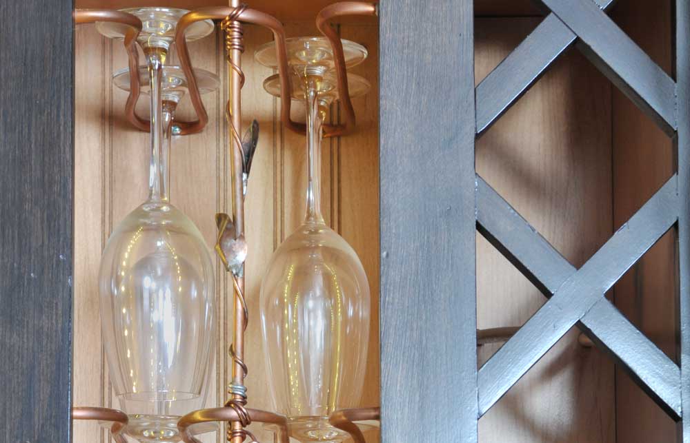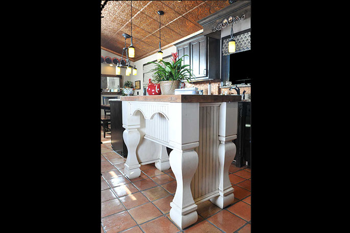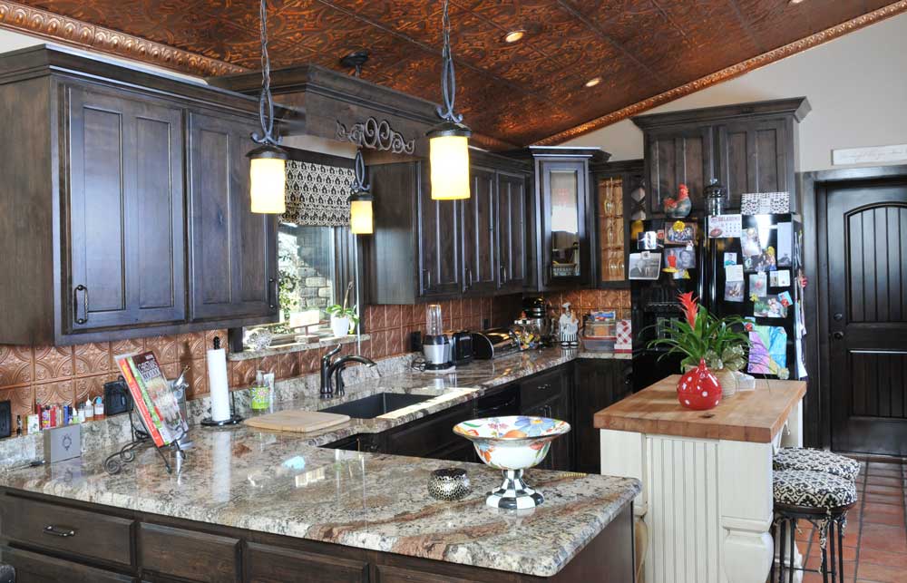 A tired 1970s kitchen received a modern update, with custom touches like hand-built cabinets, wood and copper wine glass storage, a copper tile ceiling, custom carved island and imported floor coverings.