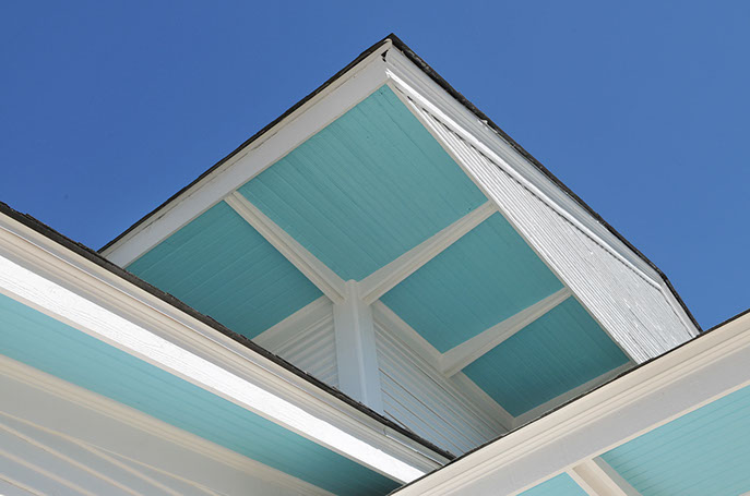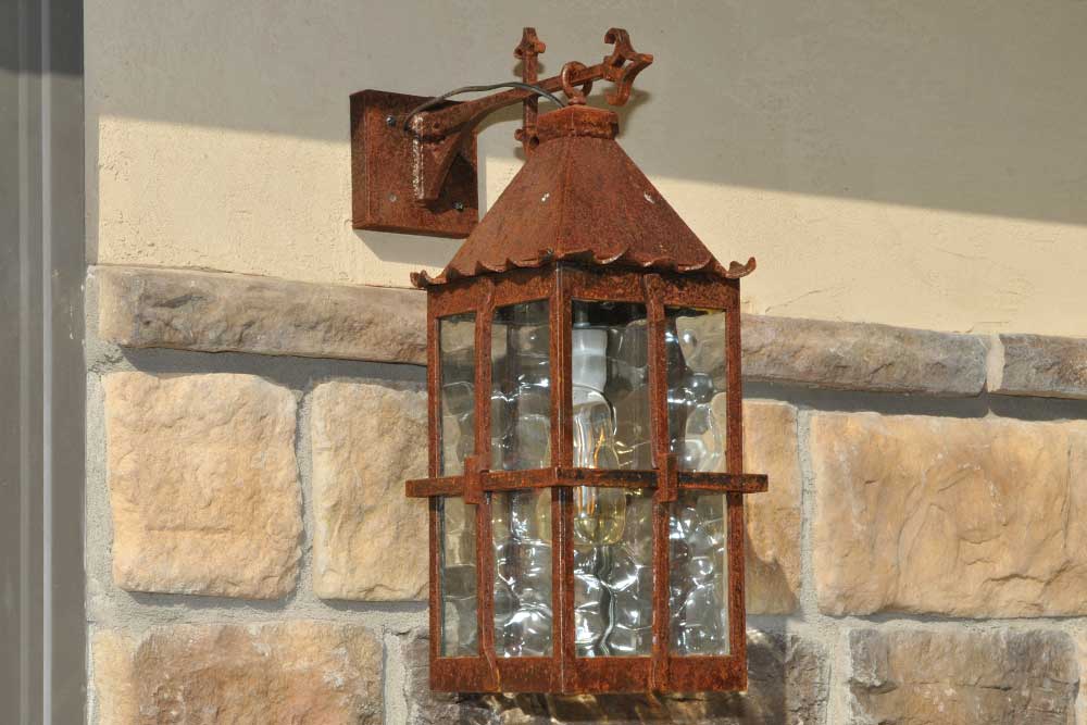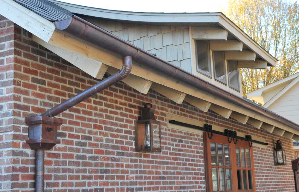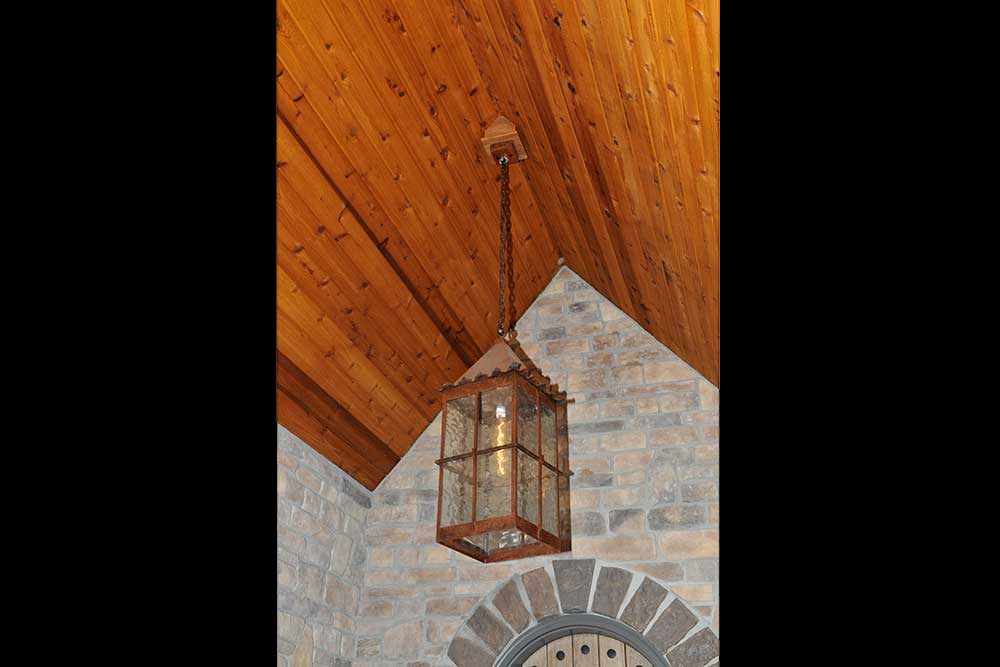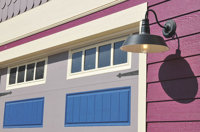 For a finishing touch, D & R Design created bespoke light fixtures, including a large copper light over the front door and sconces on either side of the garage.