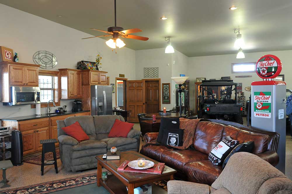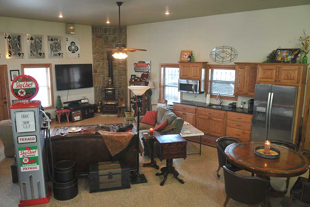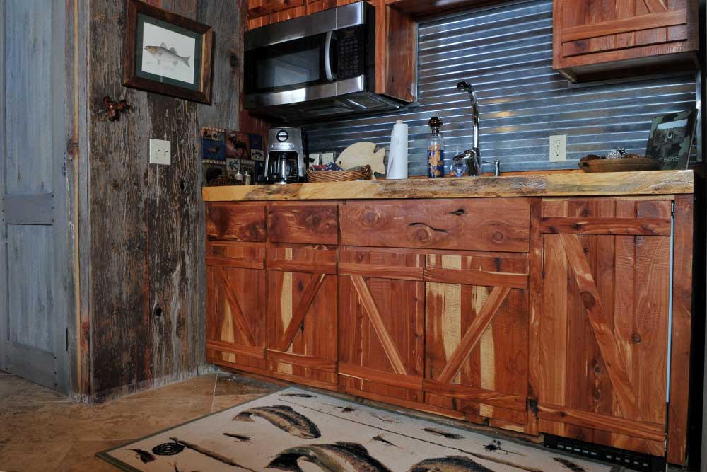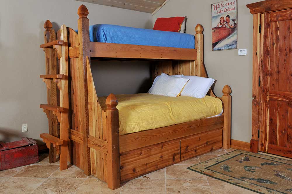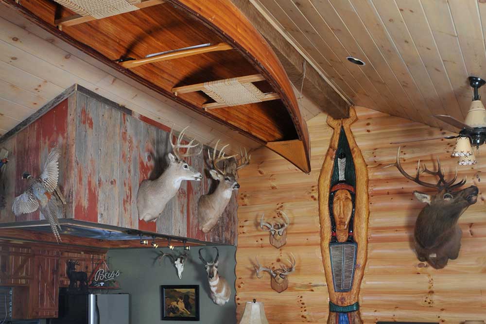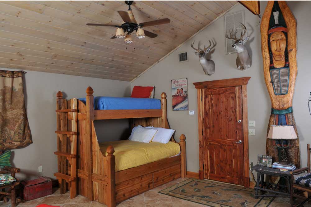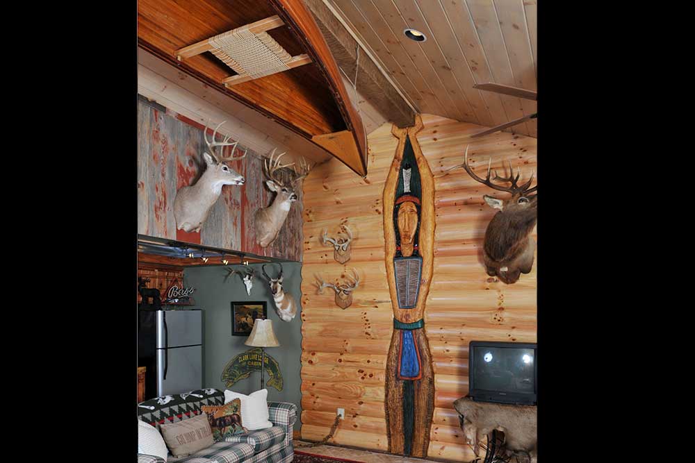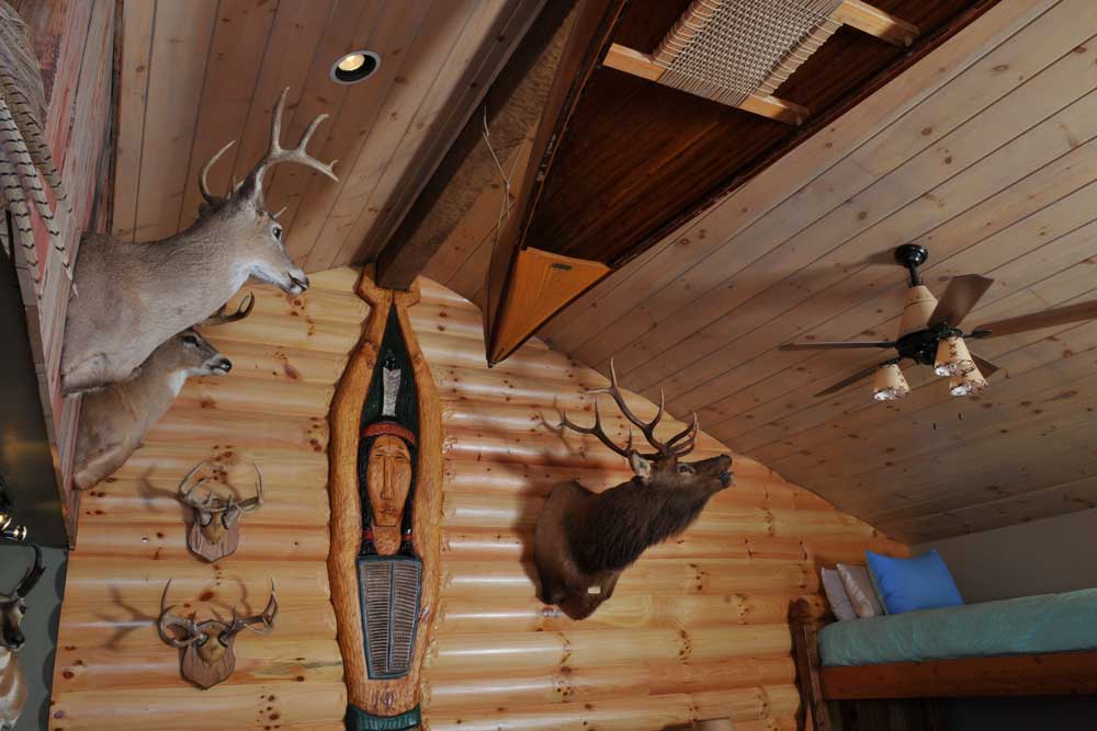 The man cave includes custom cabinetry in the kitchen and bath, custom-built bunk beds, and two 10-foot custom Native American woodcarvings that hold up the main beam.
