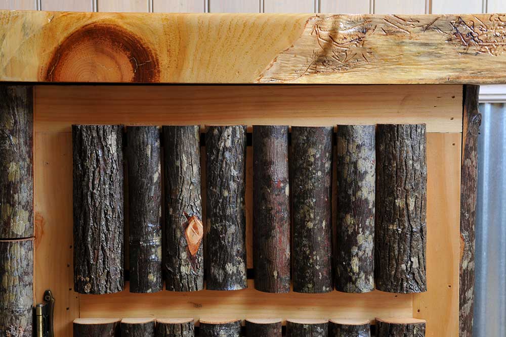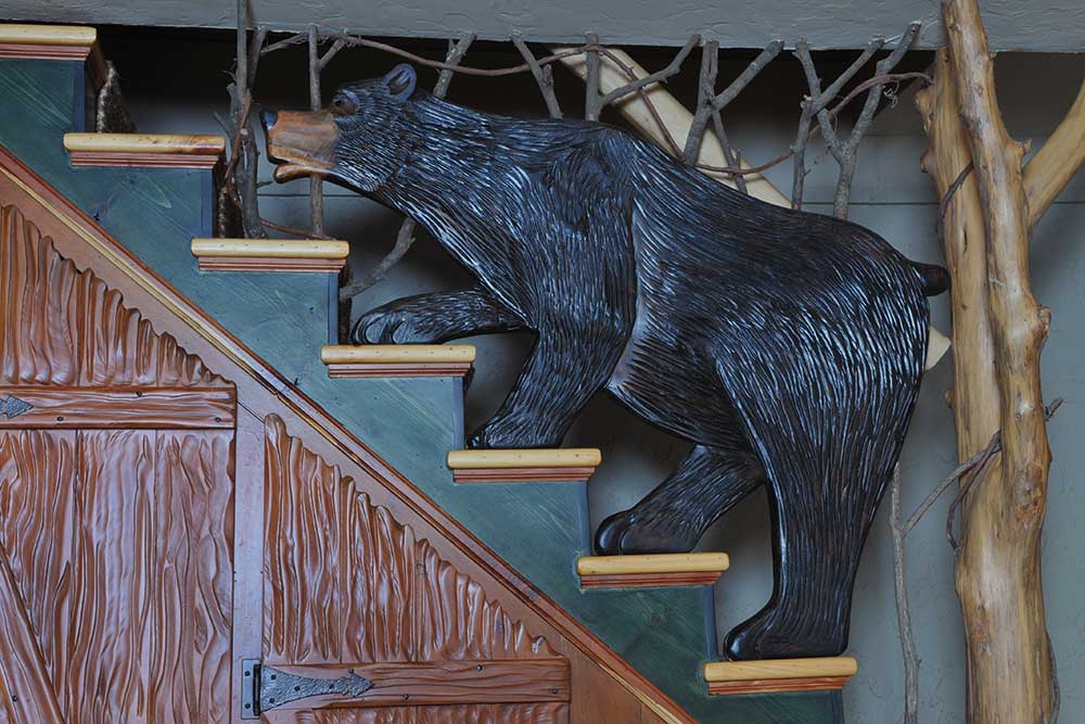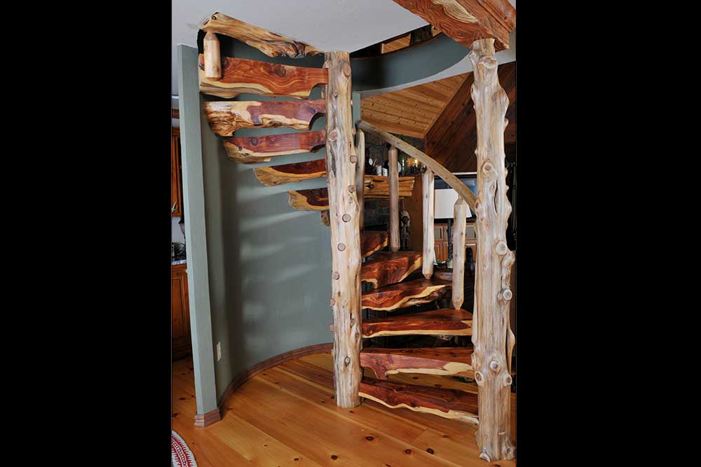 The main home features hand-carved trusses with custom fasteners for an old-school feel, a rough-hewn wood spiral staircase, and custom cabinetry with hand-made hardware and a hand-carved bear in the basement